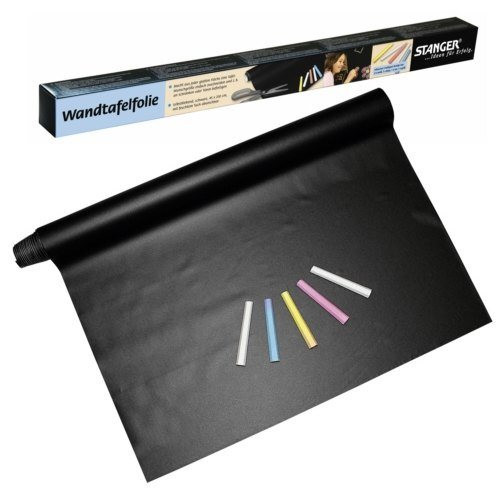 STANGER Пленка настенная с 5 мелками, 45*100см, арт. 41000014 Самоклеющаяся черная пленка с имитацией поверхности школьной доски для создания школьной доски на любой плоской поверхности, без использования крепежей, гвоздей и т.д. Для установки нужно вырезать нужный размер от доски и приклеить, например на дверь, стену, холодильник и т.д. Никакого клея для этого не требуется. Пленка самоклеющаяся и ее можно использовать многократно, т.е. можно отклеивать легко от того места где вы ее устанавливали первоначально, без нанесения какого-либо вреда поверхности. Писать по пленке можно любыми мелками. В комплект входят 5 цветных мелков. Стирается любой влажной тряпочкой. Также можно использовать жидкий мел, который у нас продается в виде маркеров.