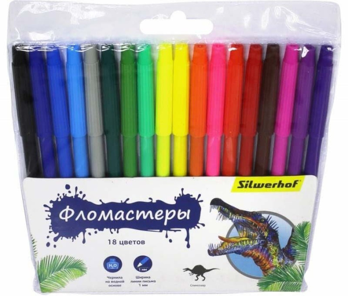 SILWERHOF Фломастеры Пластилин, арт. 867199-18.Тип по комплектации набор фломастеров. Упаковка картоновая коробка с европодвесом. Количество цветов 18. Диаметр корпуса 8 мм. Длина корпуса 129 мм. Колпачок вентилируемый.