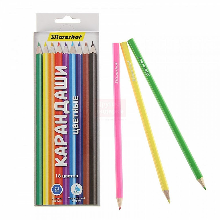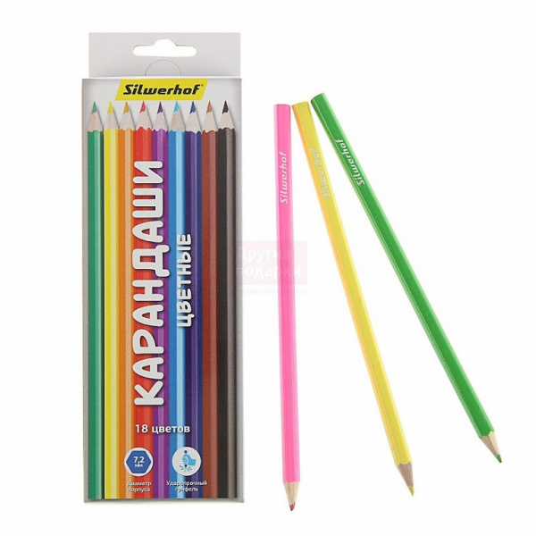 Карандаши цветные, шестигранные, арт. 134206-18. Профиль карандаша шестигранные. Диаметр 2.65 мм. Количество цветов 18. Тип упаковки картонная коробка европодвес.