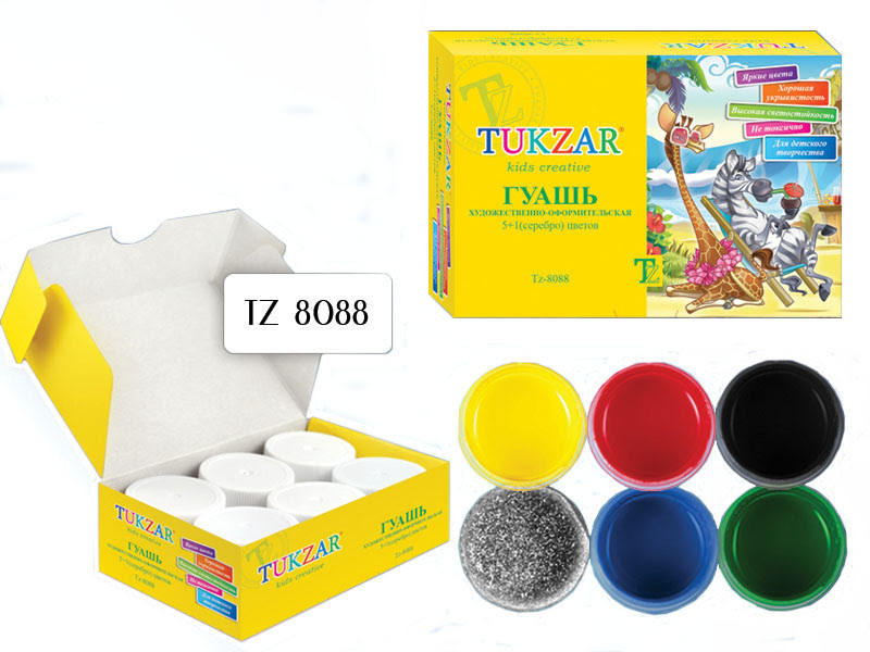 Гуашь художественная 5+1 серебро, арт. TZ 8088 TUKZAR. Качественные гуашевые краски. Яркие цвета. Не токсичны. Высокая светоустойчивость. 6 цветов по 20 мл. Картонный бокс