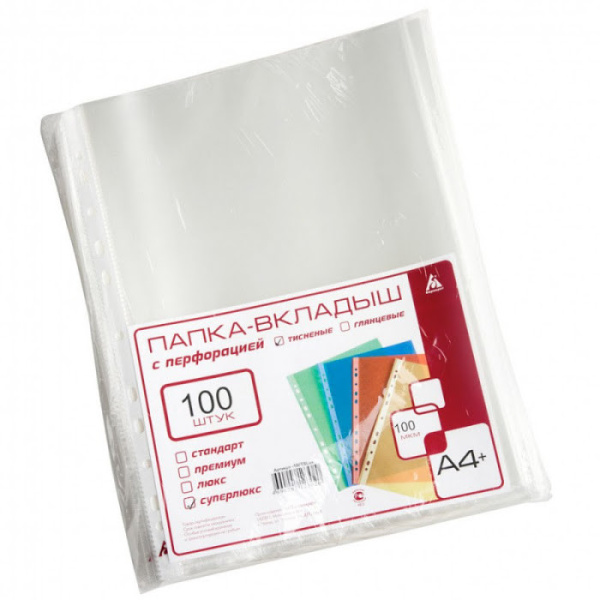 БЮРОКРАТ СУПЕРЛЮКС Папка-вкладыш глянец А4, арт. 100GSLUX. Формат: А4+. Материал: полипропилен. Плотность: 100 мкм. Цвет: прозрачный. Количество в упаковке 100 шт.