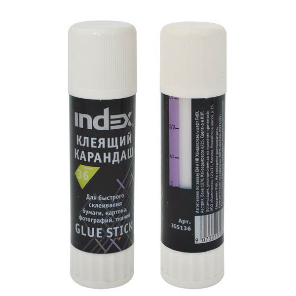 Клей карандаш, 36 гр., INDEX, арт. IGS136. Предназначен для склеивания бумаги, картона, кожи, текстиля.