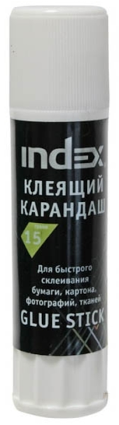 Клей - карандаш, 15 г. INDEX, арт. IGS115. Клей-карандаш «Index» предназначен для склеивания картона, бумаги, текстиля. Вес — 15 г. Не содержит цветовых пигментов (бесцветный). Легко смывается водой и отстирывается, не имеет запаха. Простой и удобный механизм, расположенный в основании стержня, позволяет легко выкрутить и закрутить столбик клея. Безопасен для детей.
