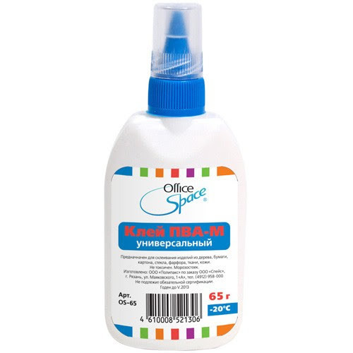 Клей ПВА-М с дозатором OfficeSpace. Предназначен для склеивания бумаги, картона, дерева. Вес нетто 65 г. Морозостойкий.