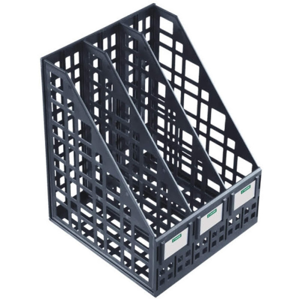 СТАММ Лоток, арт. ЛТ454. Лоток вертикальный для бумаг, сборный, 3 отделения, черный легкий и прочный, даже при максимальной загрузке документов, для листов формата А4, удобен при транспортировке и хранении, компактно упакован в термопленку с цветным вкладышем, фирменные таблички для маркировки, сборно-разборная конструкция, сетчатая поверхность, ширина основания 240 мм., материал полистирол.