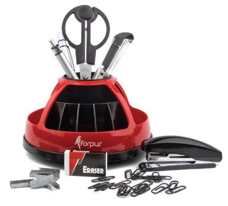 FORPUS Настольный органайзер, 9 предм., вращающийся, красный UFO, арт. FO30526, Латвия. Набор выполнен из прочного пластика высокого качества. Благодаря шарнирному основанию может вращается на 360 градусов. В комплектацию входят: линейка, канцелярский нож, две ручки, ножницы, ластик, степлер, скобы для степлера и скрепки. Цвет красный.