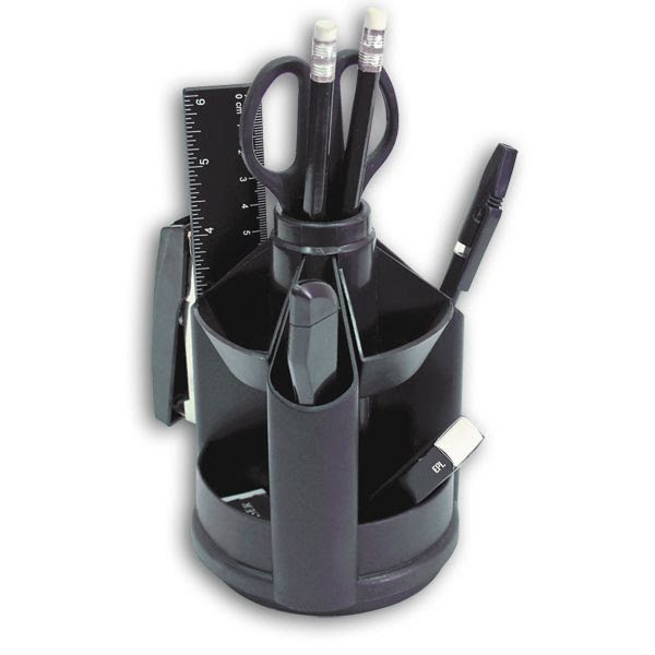 Офисный набор с вращающейся подставкой Минидеск от SPONSOR, арт. SS153. Комплектация: 11 предметов. В комплекте: 2 карандаша, ножницы, линейка, скобы №10, кнопки-гвоздики, нож, степлер №10, скрепки, ластик, подставка. Диаметр подставки: 10 см. Цвет: черный.