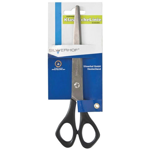 SILWERHOF Ножницы Klassische Linie, ручки пластиковые, арт. 450053. Канцелярские офисные ножницы Silwerhof эргономичного дизайна, изготовленные из стали. Пластиковые ручки имеют анатомическую форму для естественного положения инструмента в руке. Длина ножниц — 18 см. Изделие представлено на картонной подложке.