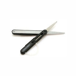 KUM Ножницы PEN CUT, Германия. Ножницы выполнены в виде ручки с колпачком. Чтобы начать работать с этими ножницами нужно снять колпачок, раздвинуть направляющие, и сдвинуть специальные фиксаторы вниз, для того чтобы выдвинулись специальные силиконовые ручки, после чего ножницы готовы к работе.