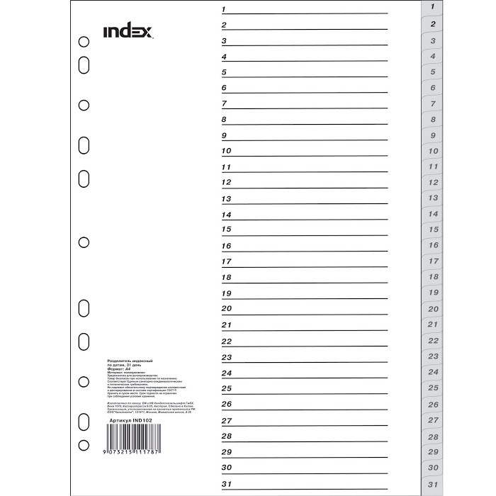 Разделитель пластиковый, по датам 31 день INDEX, арт. IND102. Разделитель с мультиперфорацией. Предназначен для папок с арочным механизмом или на кольцах. Выполнен из пластика. Формат А4.