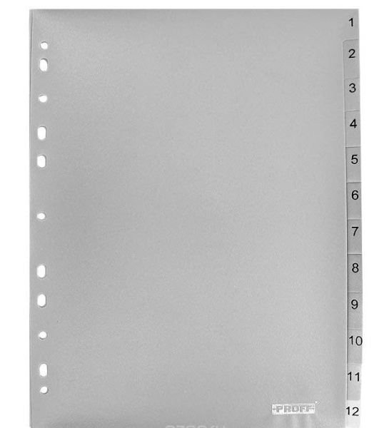 Proff Разделитель пластиковый 1-12 формат А4, арт. PFROZ1-2GREY. Набор нумерованных пластиковых разделителей листов 1-12. Обеспечивают сохранность и аккуратность листов. Удобны в использовании с папками-регистраторами и на кольцах.