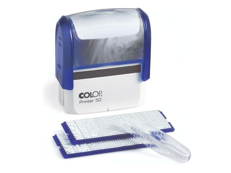 COLOP Штамп пластиковый, самонаборный, 8-строчный Printer 50-Set, 2 кассы. Комплектация – две кассы букв TypeSet A и В, сменная штемпельная подушка синего цвета, рамка. Размер поля 30х69 мм., рус, арт. Printer 50-SE