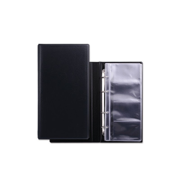 Визитница на кольцах на 160 визиток, черная с уголками, арт. П-В-160Ч. Визитница на кольцах со сменными вкладышами. Материал твердый пластик. Возможно дополнять сменными 4-х рядными вкладышами: Цвет: черный. Количество вкладышей: 20 штук.