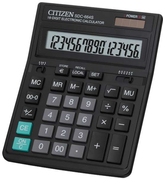 16-разрядный ЖК-дисплей, большие цифры, прочные пластиковые клавиши, питание солнечный элемент/батарея, автоматическое отключение, клавиши: “00”; знак числа; квадратный корень, клавиша MU; вычисляет наценку (прибыль), быстрая конвертация валют, используя введенный обменный курс, операции с процентом, выбор способа округления, удаление последней введенной цифры, регулировка количества знаков после запятой, размеры – 199х153х31 мм.