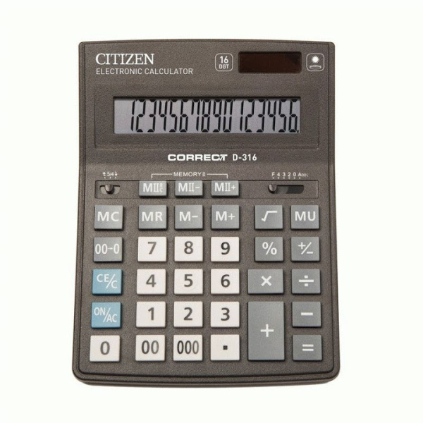 Калькулятор Citizen 16 разр. Correct D 316Функция: 000 Калькулятор в пластиковом корпусе с 16-разрядным ЖК-дисплеем. Калькулятор имеет оптимальный набор вычислительных функций: основные математические операции, расчет процентов, извлечение квадратного корня, запоминание промежуточных результатов. Электропитание калькулятора автоматически отключаются после пяти минут бездействия. Размеры, ШхВхГ: 15,5х20х1см