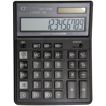 Калькулятор SDC 414, двойное питание, Original, арт. SDC-414. Настольный калькулятор в пластиковом корпусе с 14-разрядным ЖК-дисплеем имеет оптимальный набор вычислительных функций: основные математические операции, расчёт процентов, вычисление степенной функции, корректировка вводимого числа, четыре режима округления, операции с памятью запоминание промежуточных результатов. Удобная клавиатура снабжена кнопкой ввода двойного и тройного нуля. Питание калькулятора автоматически отключается после пяти минут бездействия. Технические характеристики: разрядность 14 цифр, строчность дисплея 1, питание батарея + солнечный элемент, тип батареи: GPA76 (LR44), угол наклона дисплея фиксированный, корень квадратный нет, память: да; двойная память [MI][MII], функция расчёта наценки [MU]: да; клавиша [000], вес калькулятора: 234 г.
