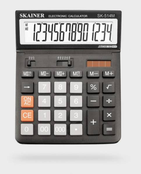 Калькулятор SKAINER SK-514, 14 разрд., черный. Настольный бухгалтерский калькулятор с ЖК-дисплеем. Независимая память, 2 ячейки. Клавиша удаления последней отображаемой цифры. Клавиши ввода «00» и «000». Ползунковый переключатель режима запятой. Ползунковый переключатель режима округления. Регулируемый наклонный дисплей. Акриловая дисплейная панель. Пластиковые клавиши. Функция быстрого ввода. Литиевая батарея питания. Солнечная батарея питания. Автоматическое выключение питания. Размеры: 146 -215 197 -215 27/53 мм.