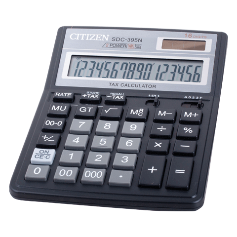 Калькулятор Citizen SDC-395N,Чехия. Калькулятор CITIZEN 16-разрядный. Однострочный дисплей, 16 цифр. Кнопка %. Двойной ноль (00). Функция расчет налогов (цена без/с учетом НДС). Квадратный корень. Функция;общий итог; (суммирование результатов всех предыдущих вычислений). Функции; расчет торговой наценки, ;округление, смена знака;. Настройки представления десятичных чисел. Три клавиши памяти. Элемент питания и солнечная батарея. Цвет черный. Глубина 192 мм, ширина 143 мм, высота 40 мм, вес 196 г.