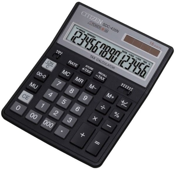 Калькулятор Citizen SDC-435N,Чехия. Настольный бухгалтерский калькулятор с 16-разрядным высоко контрастным ЖК-дисплеем. Комбинированное питание, при котором калькулятор работает от солнечного элемента при хорошем освещении, при плохом от батареи. Расчет налогов, функция вычисления набавки к цене/прибыли позволитт следить за вашим доходом. Бухгалтерский калькулятор разработан для максимального упрощения всего процесса ведения налоговой отчетности. Данная модель будет идеальным помощником в выполнении финансовых, математических, бухгалтерских и других прикладных расчетов.